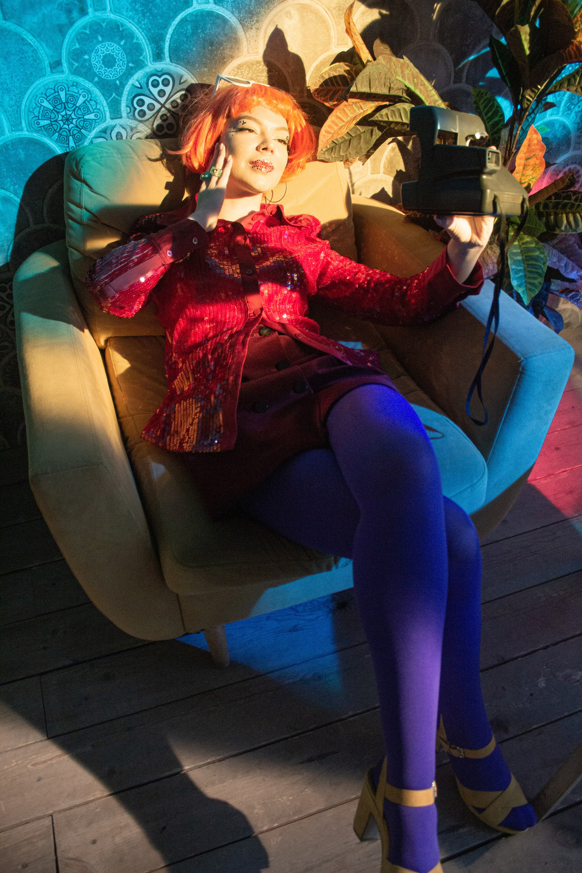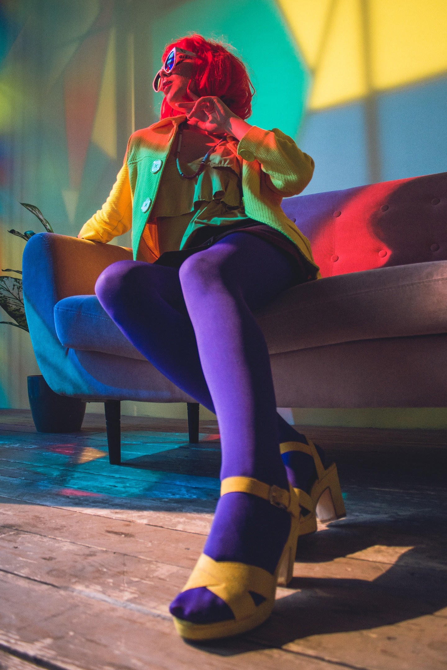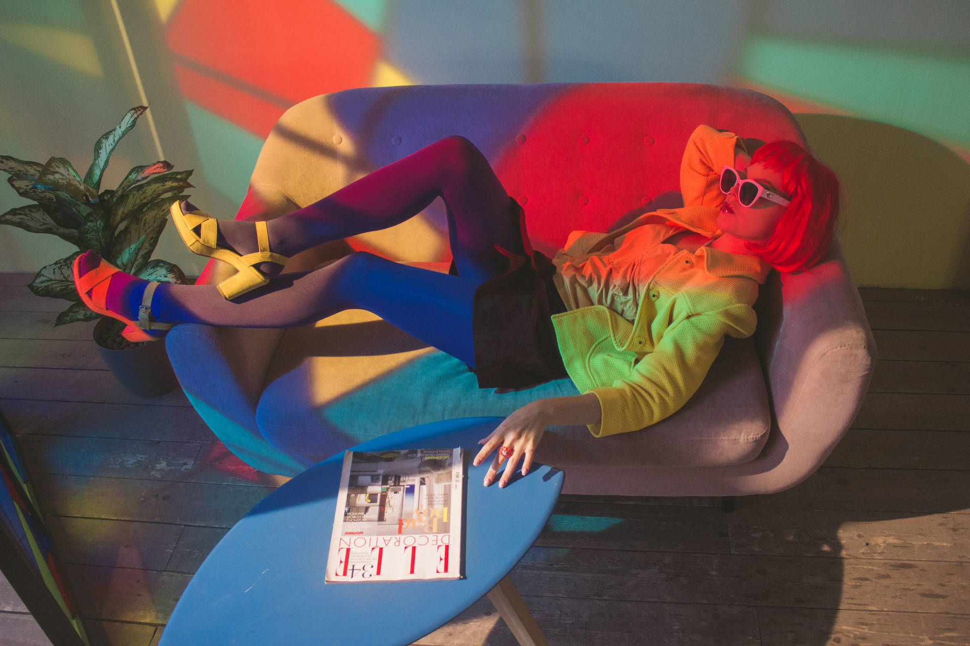 Очень своеобразная съёмка. Свет пропущен через витражные цветные окна, окрасив всю комнату студии, и модель одета в очень яркую одежду. Получилось немного винтажно-винегретно, но интересно.