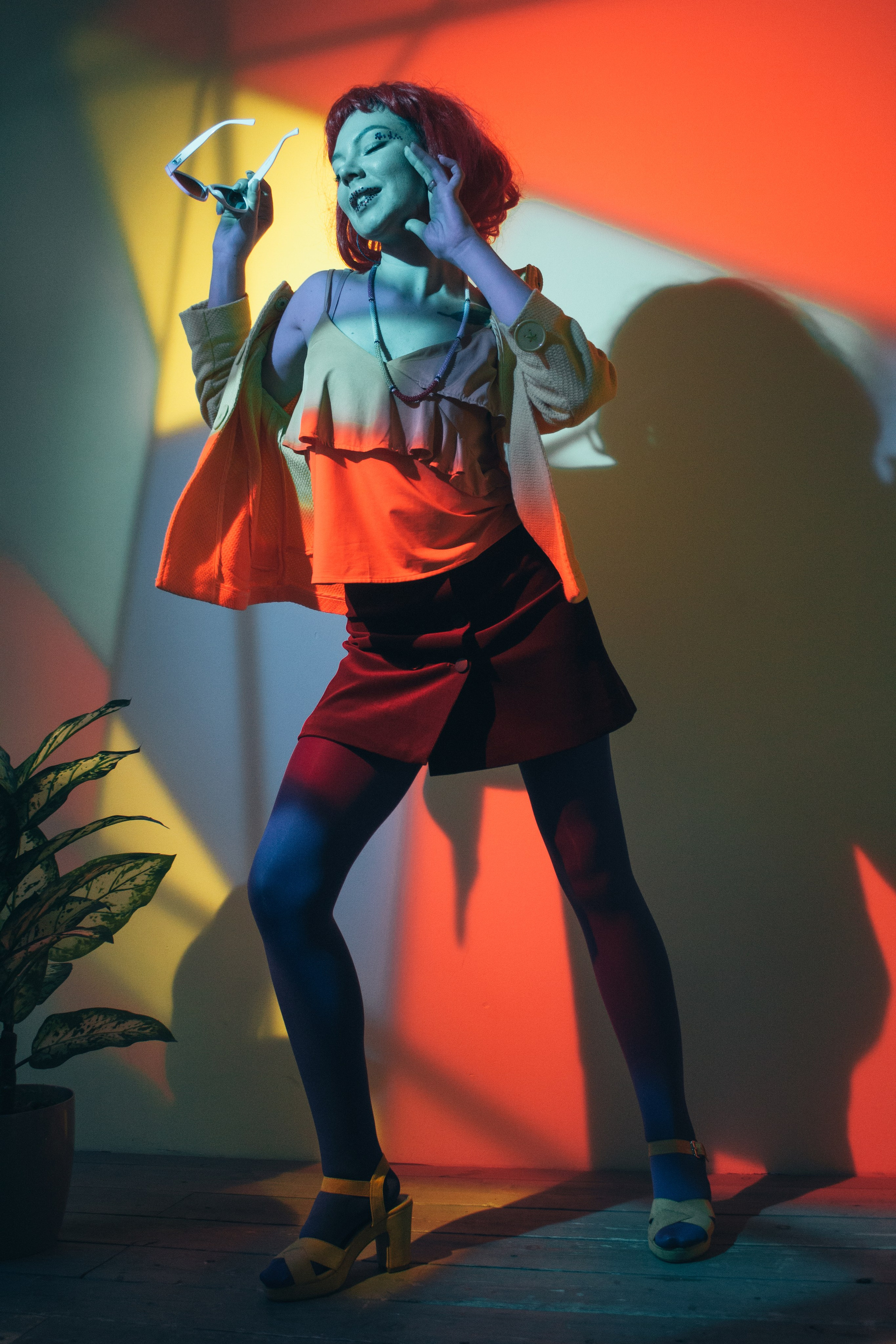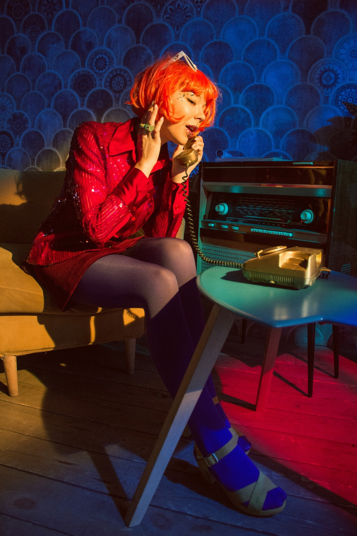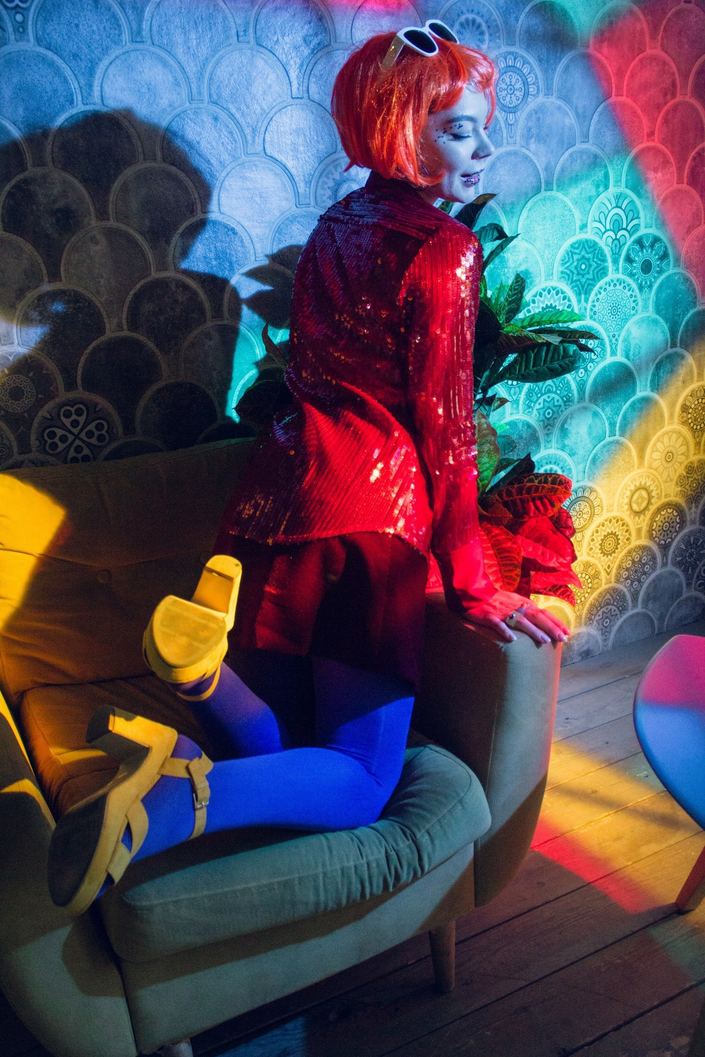 Очень своеобразная съёмка. Свет пропущен через витражные цветные окна, окрасив всю комнату студии, и модель одета в очень яркую одежду. Получилось немного винтажно-винегретно, но интересно.